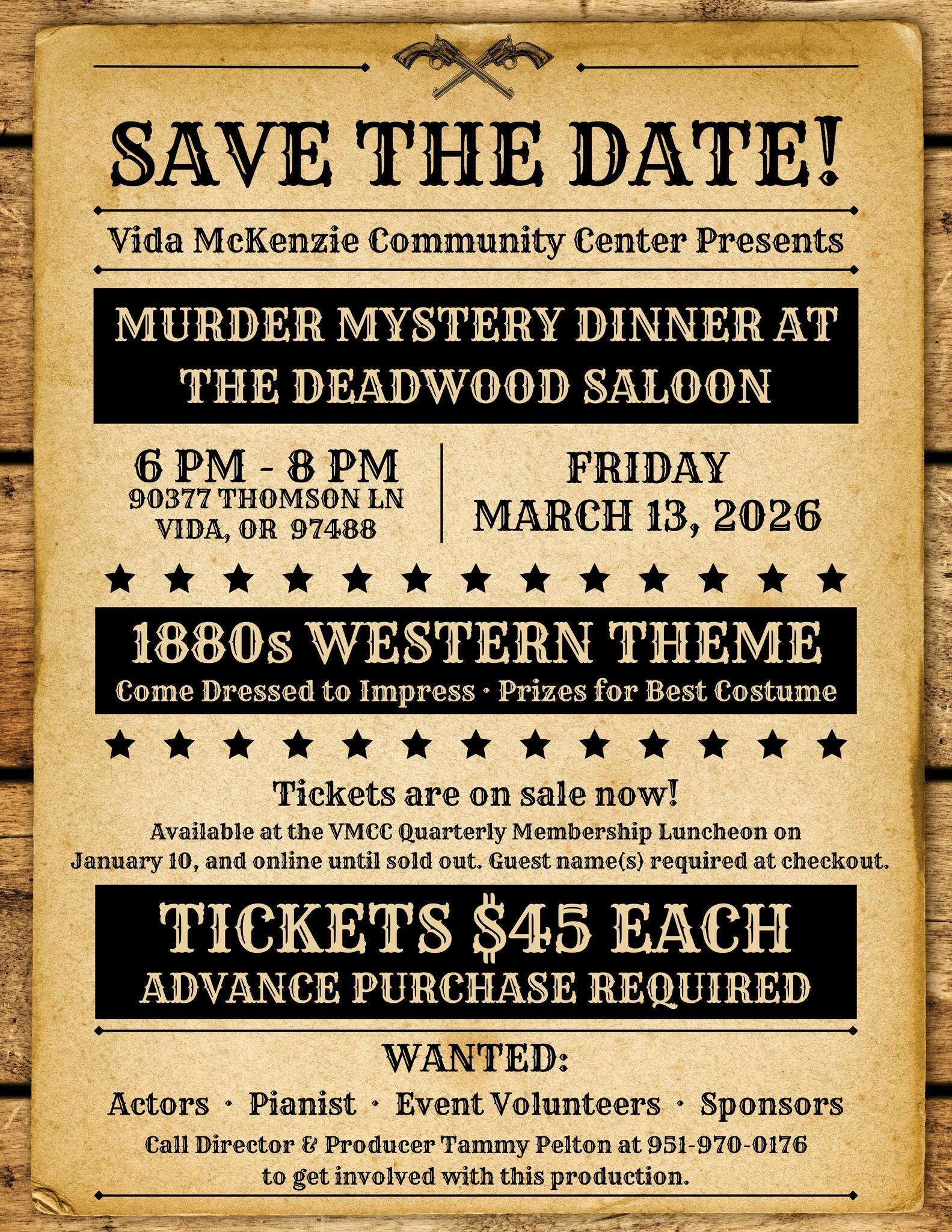 On Friday, March 13, the Vida McKenzie Community Center will host a lively, fully immersive Murder Mystery Dinner, transporting guests back to an 1880s Wild West saloon for an evening of mystery, laughter, and community connection.