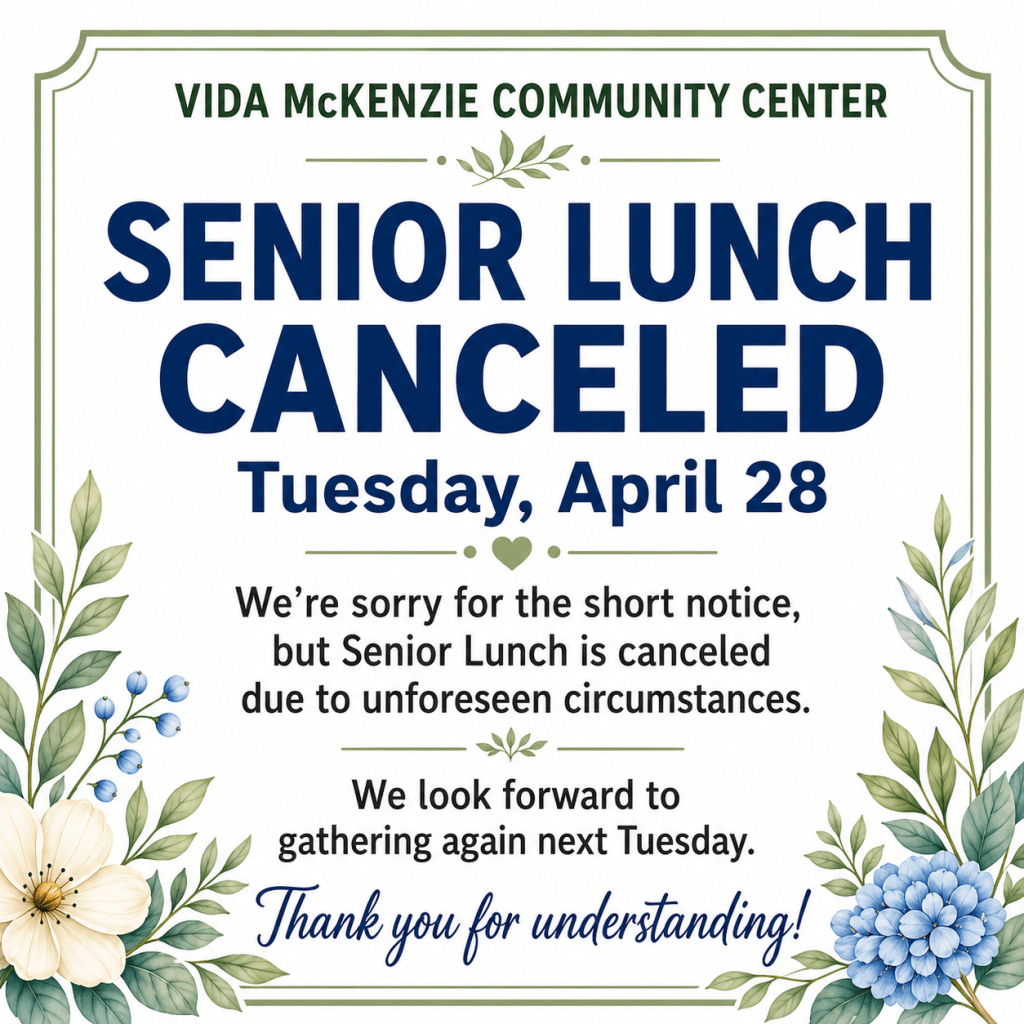 We’re sorry for the short notice, but Senior Lunch at the Vida McKenzie Community Center is canceled tomorrow due to unforeseen circumstances.