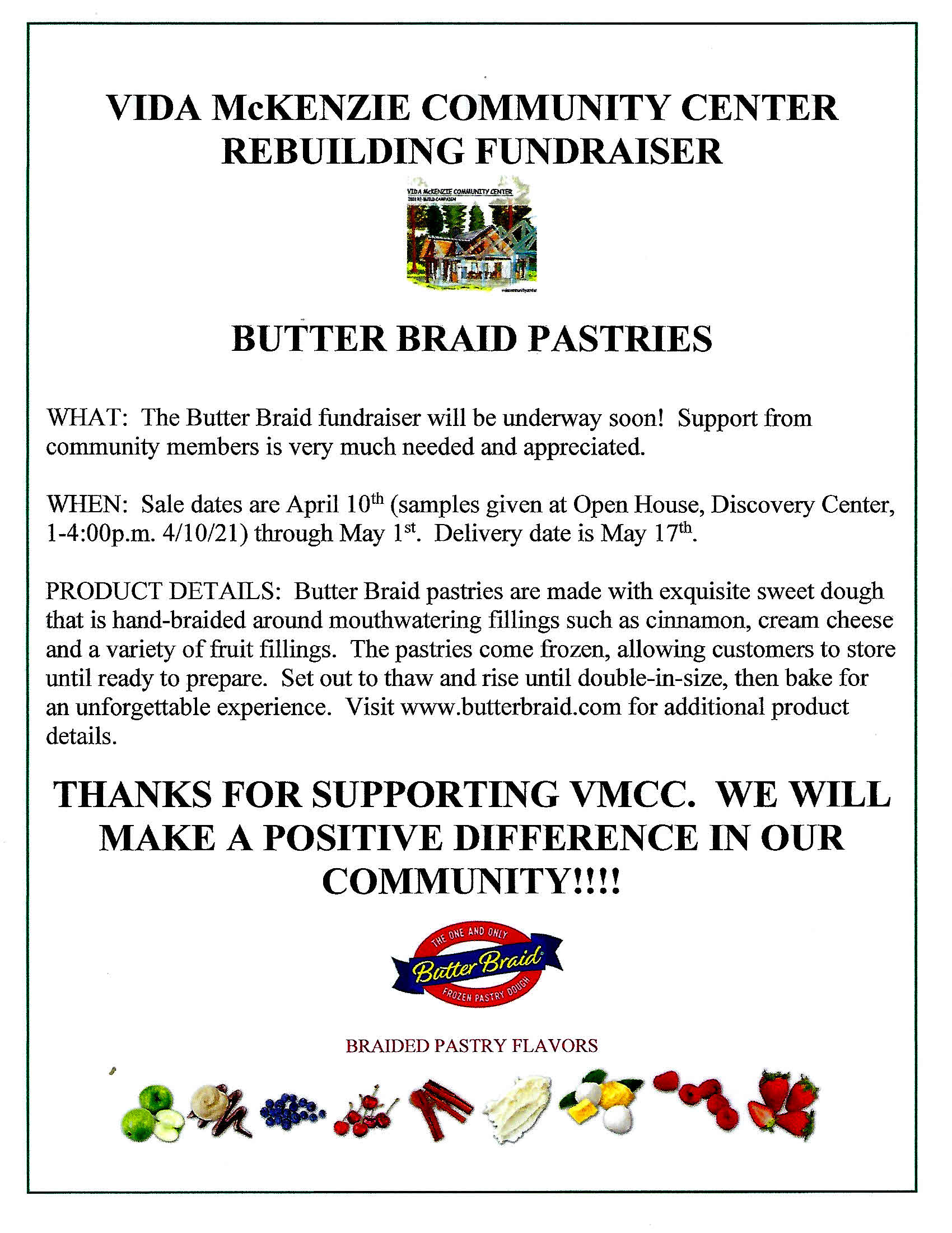 MAY 17: Butter Braid Products ready for pick up at the McKenzie Discovery Center. Freeze your product until ready for baking and serving.